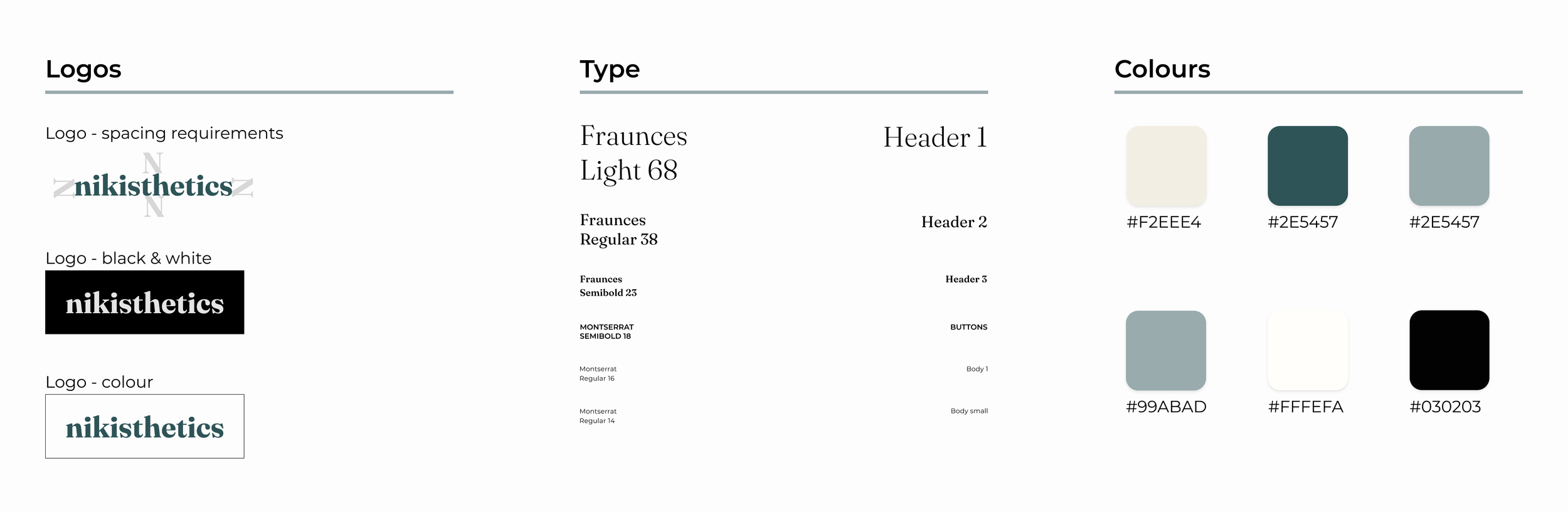 The style guide is modern, clean, and fun which reflects the Nikisthetics brand. The use of neutral colours with the pops of green let the design feel fresh, but is also inclusive, and lets the images on the website stand out. Since clients will be uploading their own images of nail designs done, the neutral colour palette allows for that without making the UI feel too heavy.